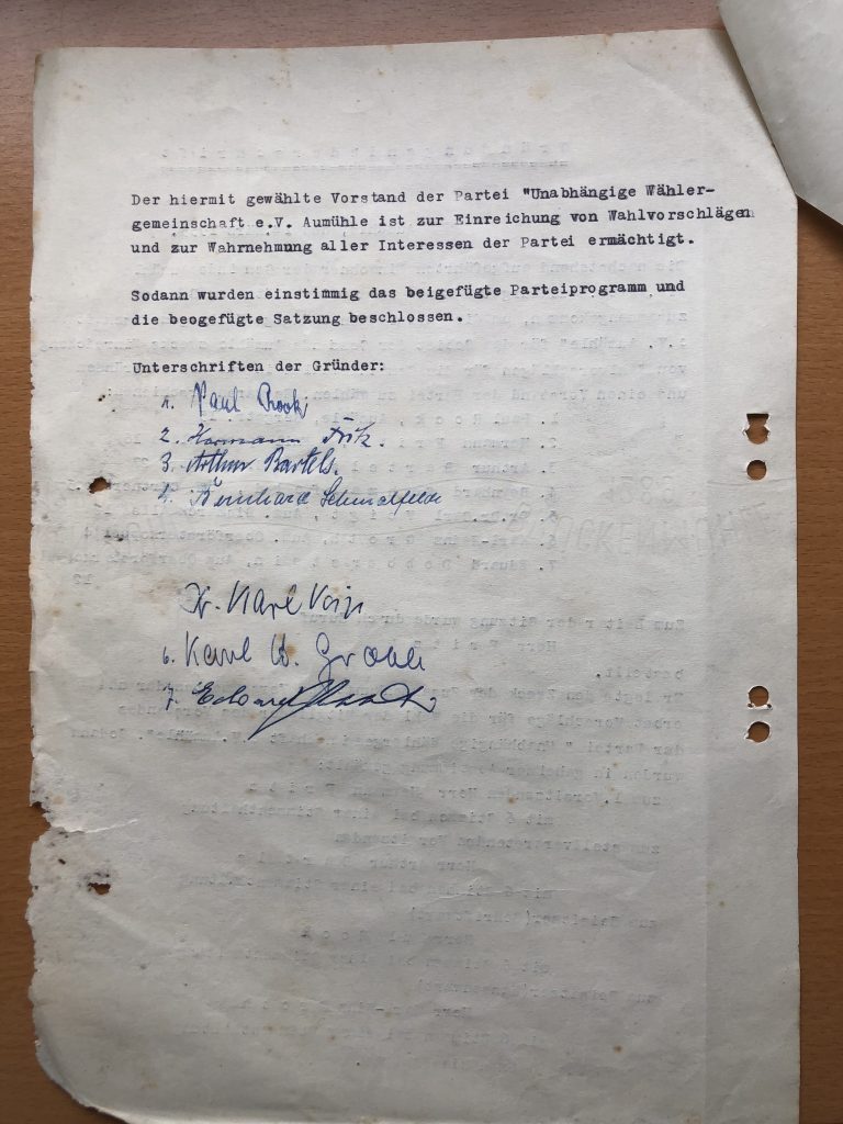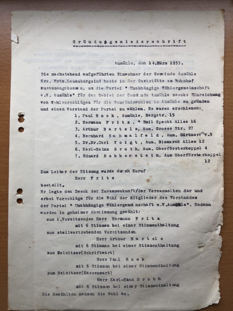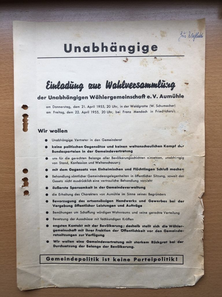 Schon damals hieß es in der Einladung zur Wahlversammlung u.a.: „Gemeindepolitik ist keine Parteipolitik!“, „Erhaltung des Charakters von Aumühle“, „äußerste Sparsamkeit in der Gemeindeverwaltung“, „für gerechte Belange aller Bevölkerungsschichten“ und „keine politischen Gegensätze und keinen weltanschaulichen Kampf der Bundesparteien in der Gemeindevertretung“.