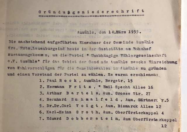 Die Unabhängige Wählergemeinschaft UWG wurde am 14. März 1955 von 7 Aumühler Bürgern gegründet, um unabhängige Kandidaten für die Kommunalwahl am 24. April aufzustellen. Schon damals hieß es im Wahlaufruf u.a.: „Gemeindepolitik ist keine Parteipolitik!“, „Erhaltung des Charakters von Aumühle“, „äußerste Sparsamkeit in der Gemeindeverwaltung“, „für gerechte Belange aller Bevölkerungsschichten“ und „keine politischen Gegensätze und keinen weltanschaulichen Kampf der Bundesparteien in der Gemeindevertretung“. Diese Grundgedanken finden sich auch heute noch in den Wahlprogrammen der UWG, sie haben ihre Berechtigung über die Jahrzehnte behalten!